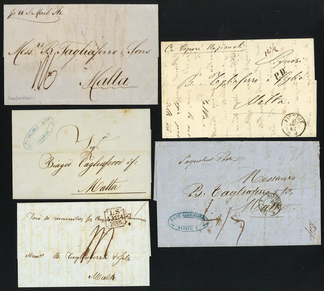 1855 (4 June) unstamped entire letter from London with clear despatch datestamp; 1856 (26 Nov.) unstamped entire letter from Marseilles showing part double-arc arrival d.s. on reverse; 1857 (14 Feb.) unstamped entire letter from Genoa without postal markings; 1863 (5 Aug.) unstamped entire letter from Havana, rated "1/6" and showing, on reverse, despatch, London and arrival datestamps; also 1865 (13 Dec.) entire (stamps cut away) from Florence with disinfection slits. An interesting lot