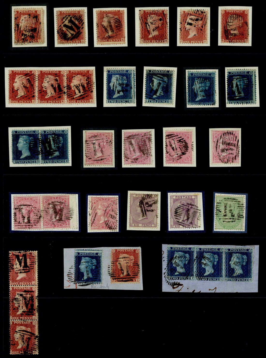 A range comprising 1d. strips of three (2, one vertical) and singles (7, one on piece with 2d.), 2d. strip of three (on piece), pair and singles (4), 4d. pair and singles (5, three with perfs. cut off one or more sides), 6d. (2, one with trimmed wing-margin at right) and 1/-, most with fine clear strikes, condition generally fine. Cat. £1,400+
