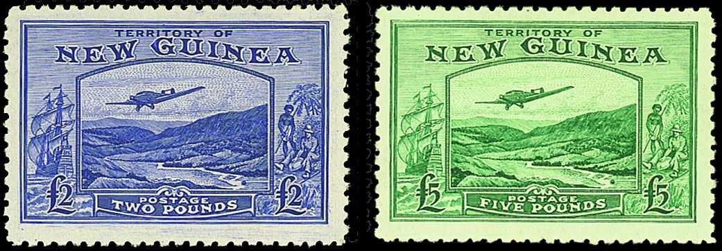 1935 Air £2 bright violet (a little wrinkle at right) and £5 emerald-green, fine mint. S.G. 204-205, £1,100. Photo