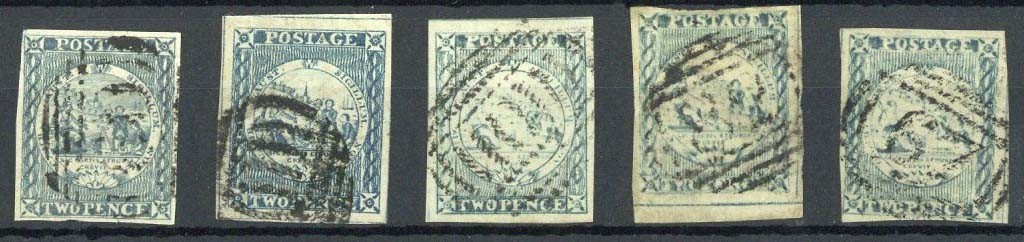 2d. Pl. I early impression greyish blue, intermediate impressions greyish blue and deep blue, and later impressions greyish blue and dull blue, all with four margins, fine used. Cat. £1,625