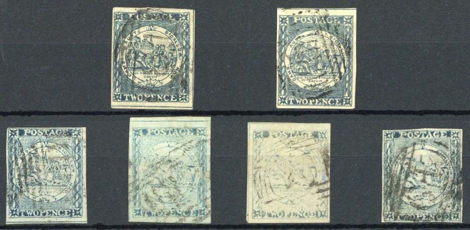 2d. Pl. II early (2), intermediate (2, one retouched) and worn impressions, various shades, all with four margins (one cut close at top and one close on all sides), generally fine used. Cat. £1,600+