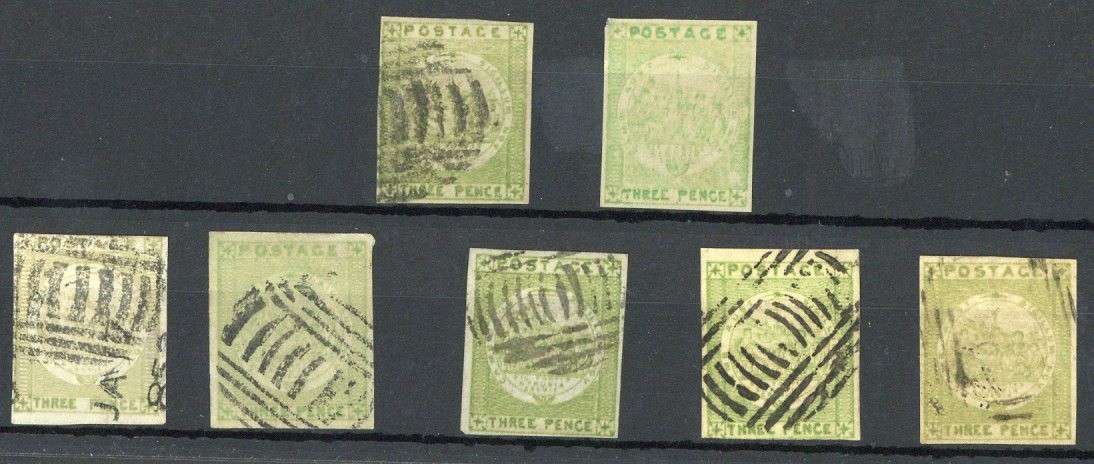 3d. soft yellowish paper (2), bluish to grey paper (3) and laid paper (2, one with no whip), all with four margins, good to fine used. Cat. £2,300+