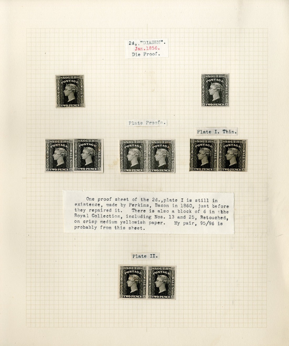 2d. Plate I in black on wove paper, pairs (2) and singles (2), a pair in black on thin paper, and Plate II pair, [95-96], in black on wove paper, fine