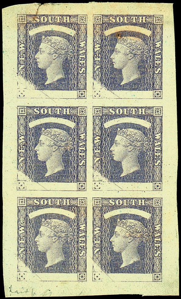 The following six lots comprise small format design blocks of six with "postage" and value tablets blank, and with void lower left corner