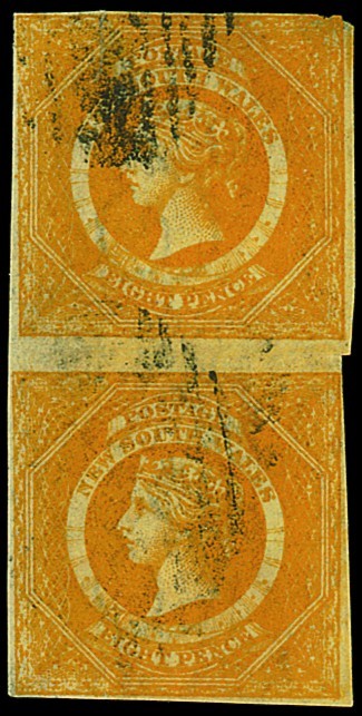 1854-59 8d. rich golden yellow (1st printing) vertical pair, the lower stamp with clear to large margins, the upper touched at one corner and with tear, cancelled by dumb obliterator. A rare multiple. S.G. 97. Photo