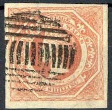 — 1/- rosy vermilion, error watermark "8", large margins, fine used. S.G. 99a, £180