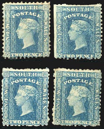 1860-72 perf 12, 2d. pale blue (Pl. I), four unused examples, three with part or small part original gum, one of which has clipped perfs at top and one with light diagonal crease. S.G. 133, £2400