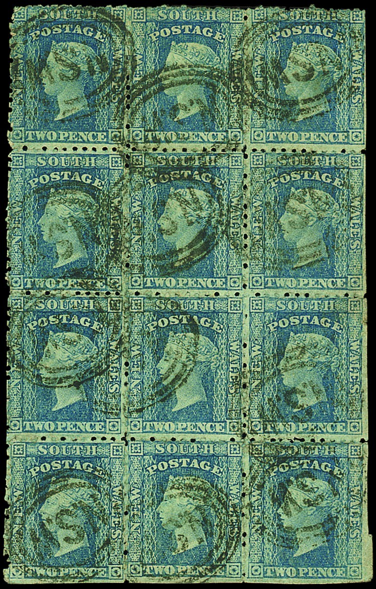 — 2d. pale blue (Pl. I) lower right corner block of twelve (3x4) with the normal imperforate margins at right and at foot, some pressed creases otherwise fine used. A very rare multiple. S.G. 133, £1,680. Photo