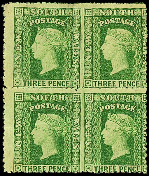 — 3d. yellow-green block of four on watermark double-lined "6", unused with large part original gum, the lower pair with light bend, fine. S.G. 157a, £760. Photo