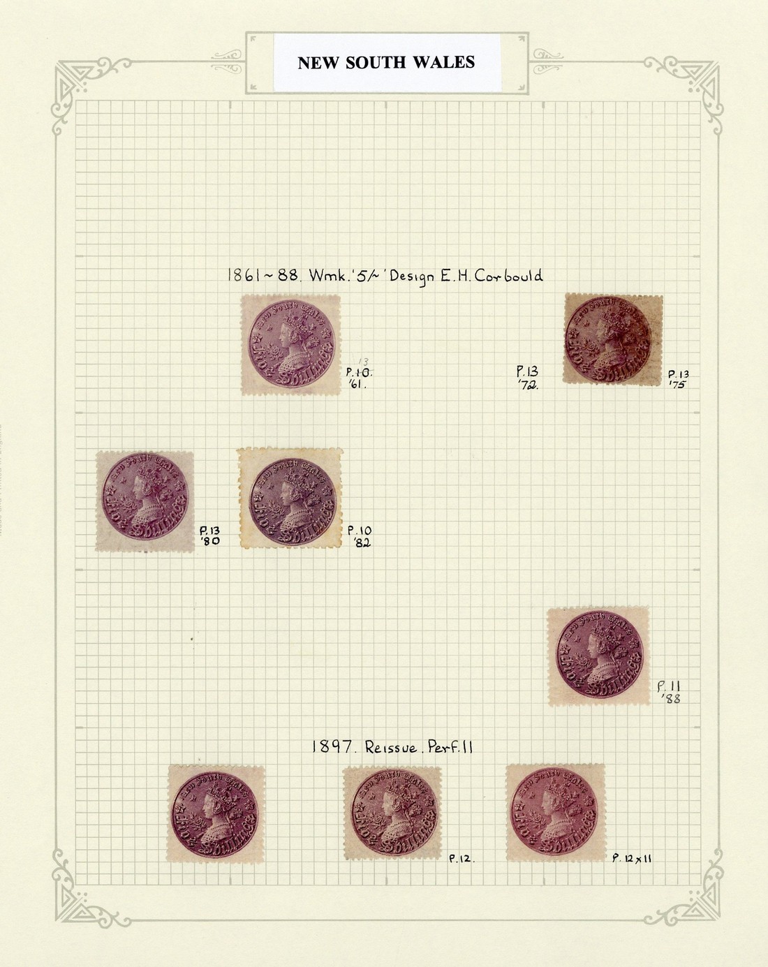 1861-97 5/- Coin range including 1861-88 perf. 13 (3), perf. 10 and perf. 11 mint/unused, perf. 12, perf. 13 (4), perf. 10 (3), perf. 12x10 and perf. 11 used, and 1897 re-issue perf mint and used, perf.12 mint and used, perf. 12x11 mint and perf. 11x12 used; generally good to fine. Cat. £2400+