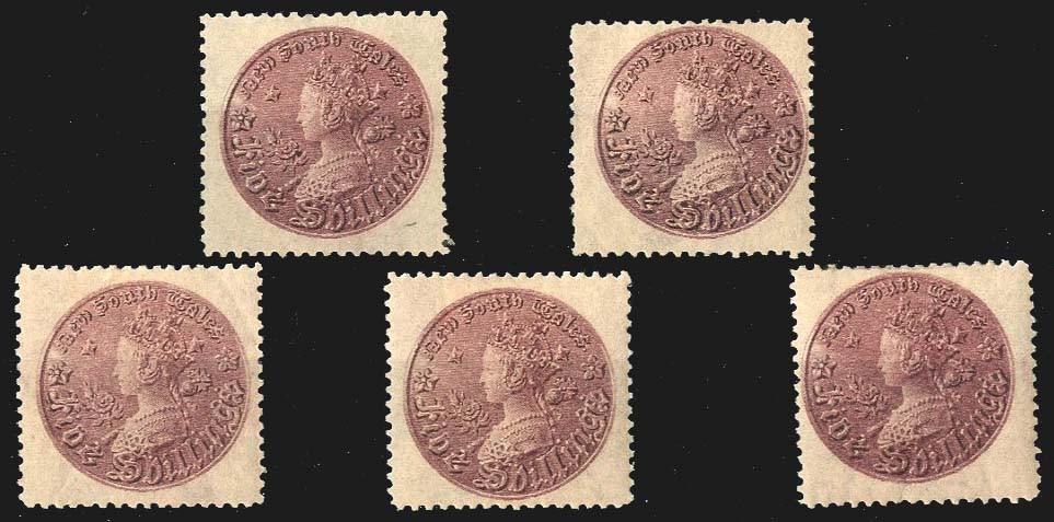 1861-88 5/- Coin perf 12, purple, five unused examples in slightly differing shades, one without gum and another thinned, the others fine with large part original gum