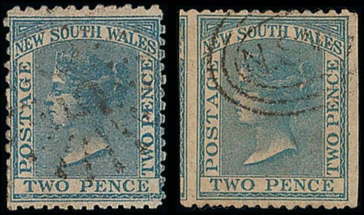 — perf 12x13x13x13 2d. blue, fine and lightly cancelled, rare; also two other examples, one perf 12 (badly thinned and a little soiled; ex Yardley), the other perf 13 x imperf (toned), both used