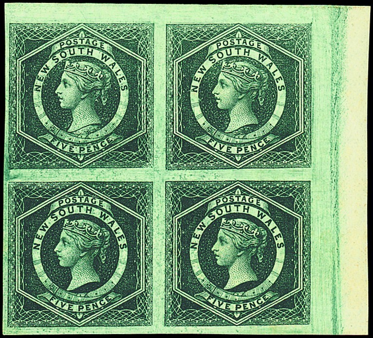 — 5d. blue-green top right corner block of four, variety imperforate, some gum creases otherwise fine. S.G. 233e, £950. Photo