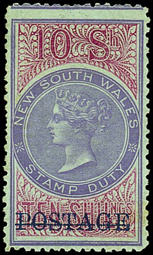 1885 overprinted "postage" in blue, perf. 12 10/- mauve and claret, fine unused with part original gum. S.G. 241b, £275. Photo