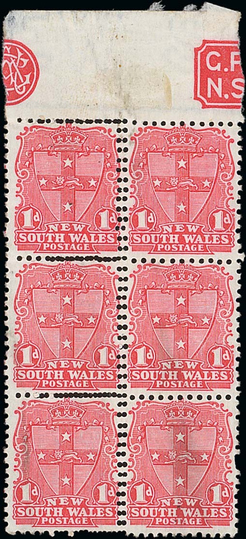 1899 watermark Crown over "NSW" (II), chalk-surfaced paper 1d. scarlet block of six (2x3) with margin at top, showing vertical perfs. between double and horizontally on first row, fine mint