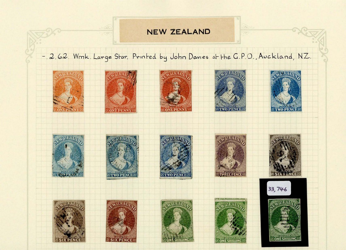 1d. (3), 2d. (5), 3d., 6d. (3) and 1/- (3), shades, mainly with good to large margins, variously cancelled with two 2d. having c.d.s.; a few small faults though of good to fine appearance. B.P.A. Certificate (1990) for one 1/-. S.G. 33-46 group