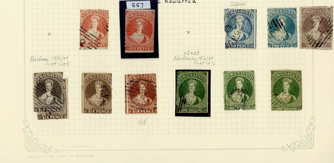 1d. (two shades), 2d. (two shades), 3d., 6d. (four shades and 1/- (three shades), mainly with roulettes on two or more sides; faults in places though of generally good to fine appearance. Certificates for two. S.G. 47-58 group