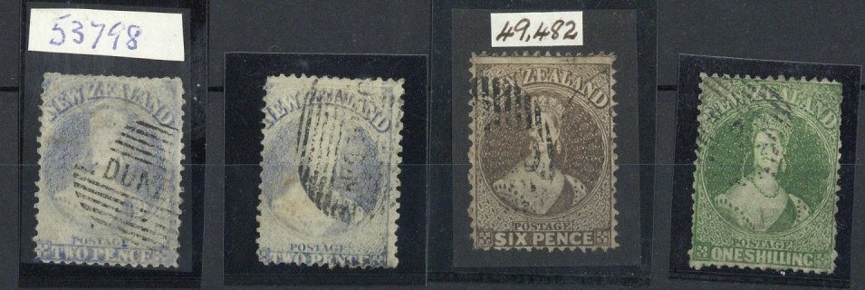 Perforated 13 at Dunedin 2d. (two shades), 6d. black-brown and 1/- deep green, variously cancelled; one 2d. reperforated at right and 1/- repaired at upper left corner. R.P.S. Certificates for three. S.G. 91-94