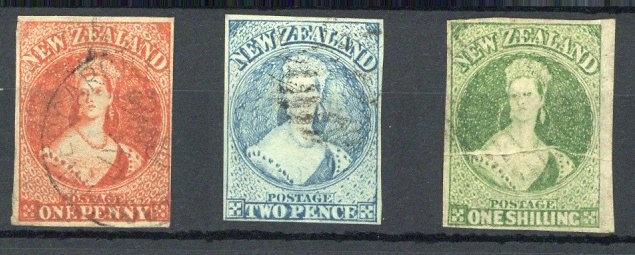 1d. carmine-vermilion with just clear to large margins and Invercargill c.d.s., 2d. pale blue with clear to good margins, and 1/- green with good to very large margins and lightly cancelled, pre-printing horizontal paper crease. S.G. 97, 98, 100, £900
