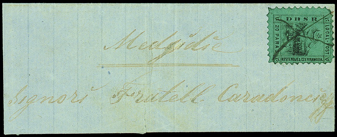 1867 20p. black on deep green, just tied by pen cross on part undated entire addressed to Medjidie, small faults but extremely rare. Ferchenbauer Certificate (1983). Also 1867 stampless entire from Galatz to Genoa. Photo for first