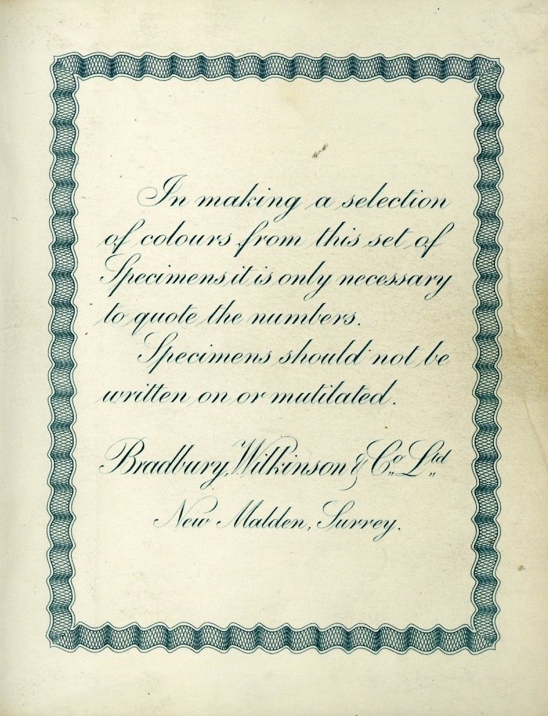Printers Samples: 1957 "Bradbury Wilkinson Ltd. Plate Colour Chart", a small booklet containing 25 impressions of an engraving depicting a Windmill by the riverside in different colours (with a further 4 duplicated loose pages); fine and most unusual