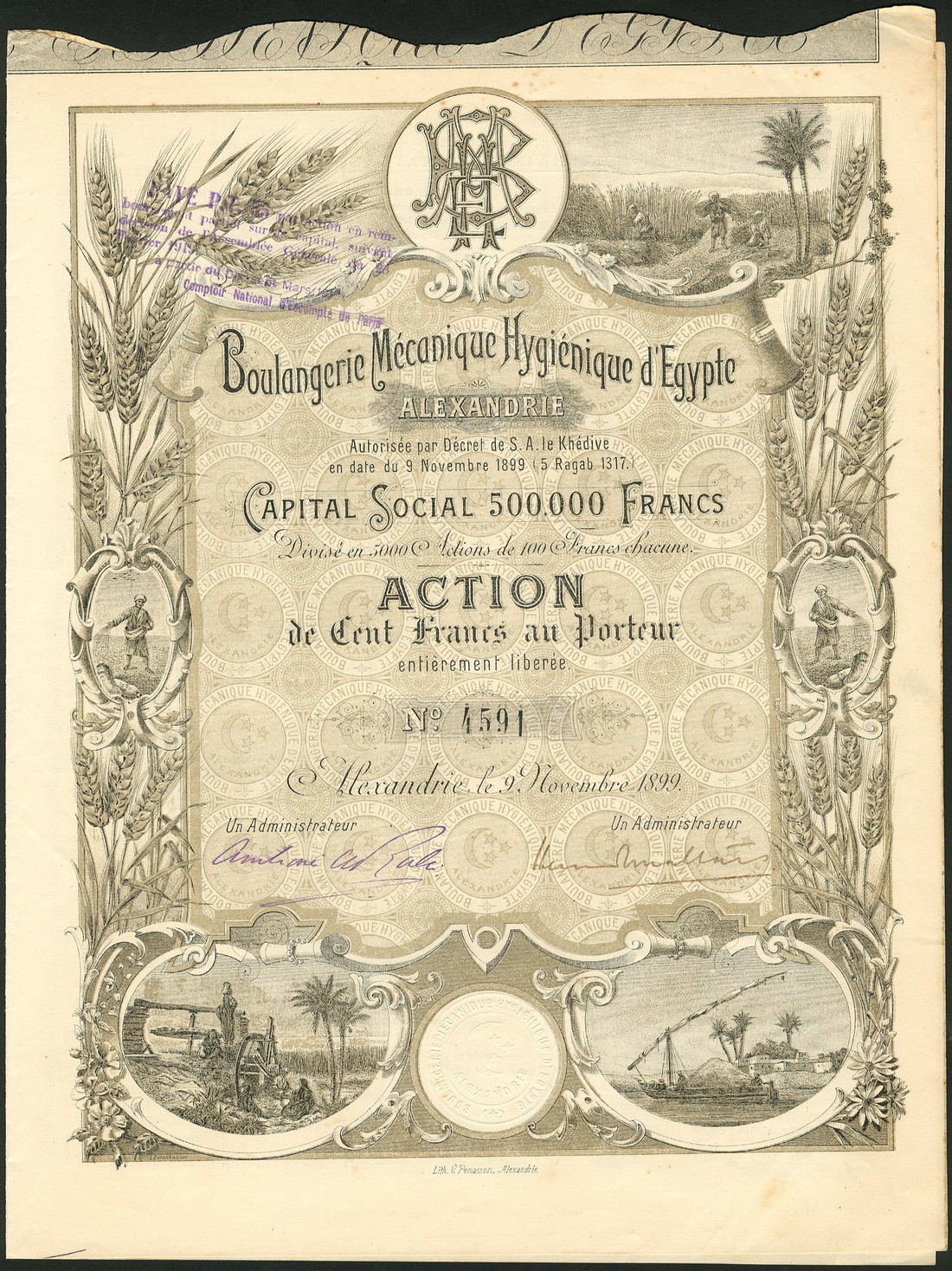 Boulangerie Mecanique Hygienique d'Egypte, 100 franc share, Alexandria 1899, no.4591, very attractive piece with workers in field, river boat and well, brown, with coupons, together with other French financed Egyptian companies (4), comprising Soc. Gen. des Sucreries et de la Raffinerie d'Egypte, 1897; Soc. Fonciere du Domaine de Cheikh Fadl, 1938; Soc. Cooperative de Consommation des Fonctionnaires du Gouvernement, 1910 and Soc. Egyptienne d'Entreprises Urbaines & Rurales, 1905, cancelled, very fine and better. (5)