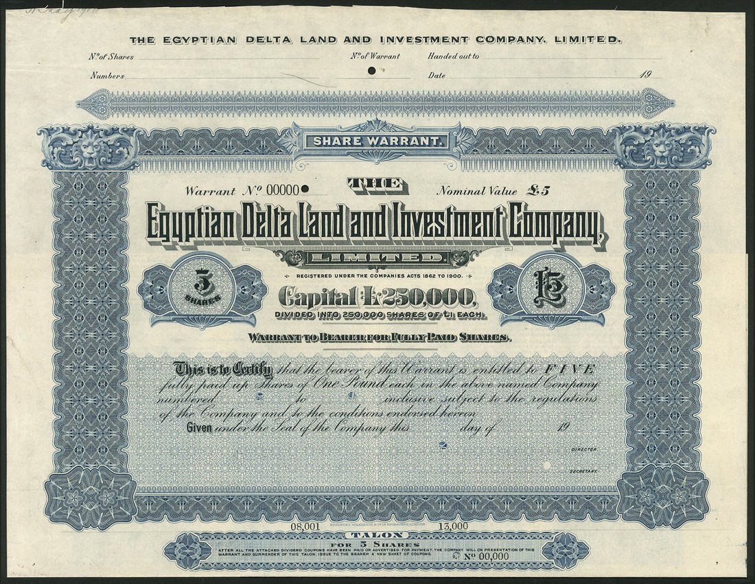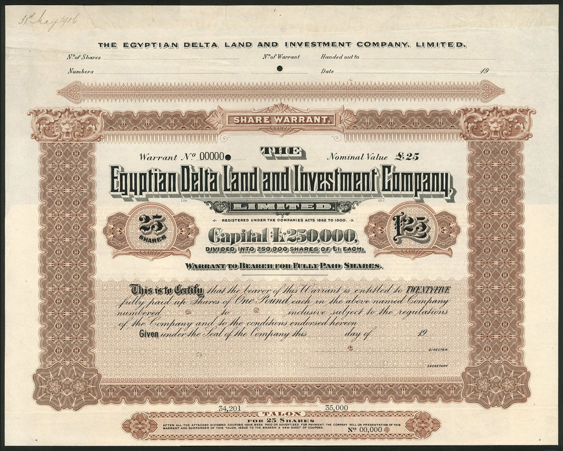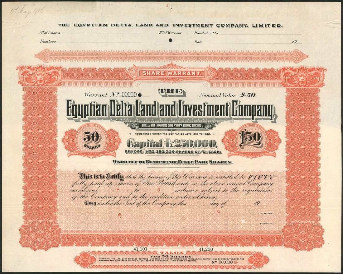 Egyptian Delta Land and Investment Co. Ltd., a group of three specimen bearer warrants for 5, 25 and 50 shares of £1 each, from the Bradbury, Wilkinson & Co. archive, 19- (annotation for 1906), ornate border, blue, brown and red respectively, numbered 00000, with coupons, extremely fine. (3)