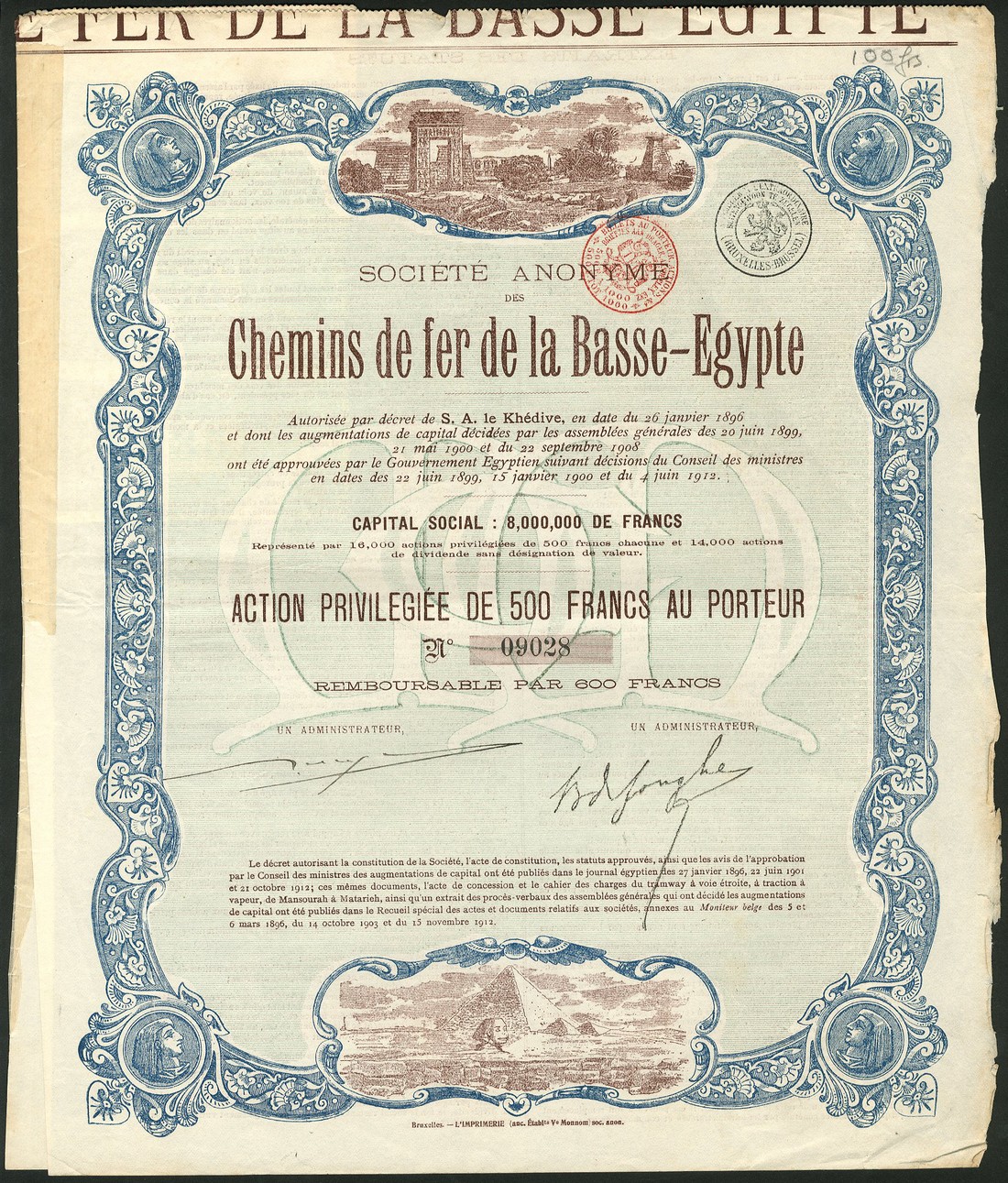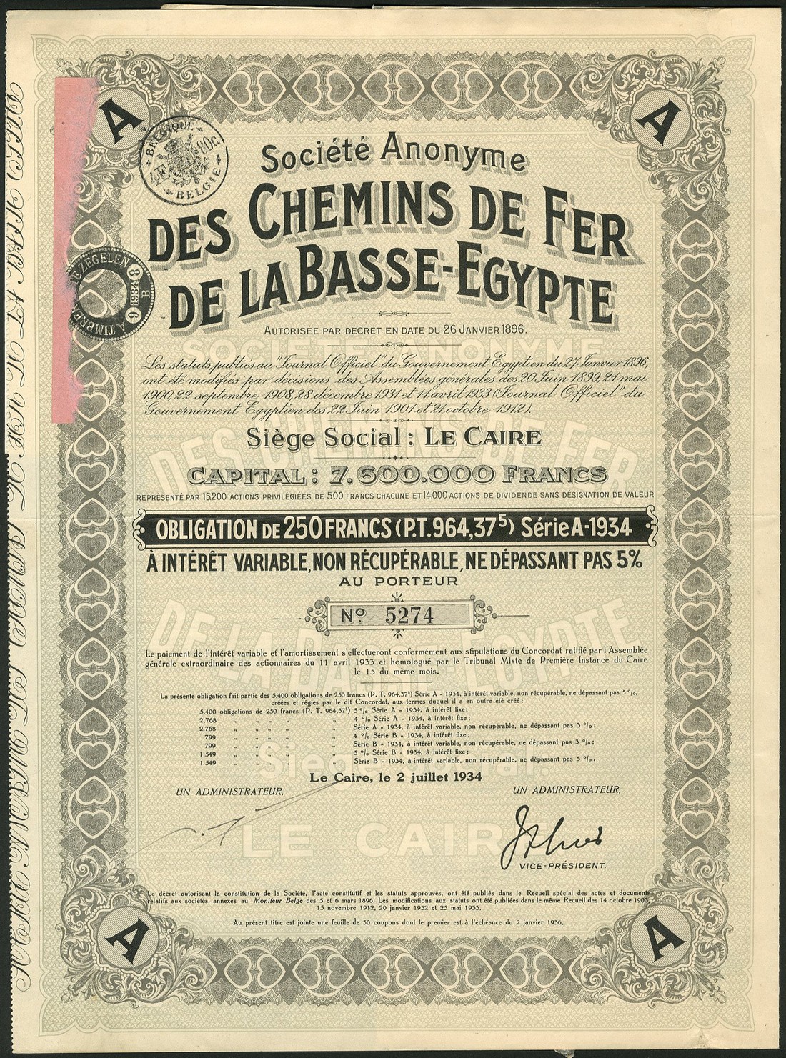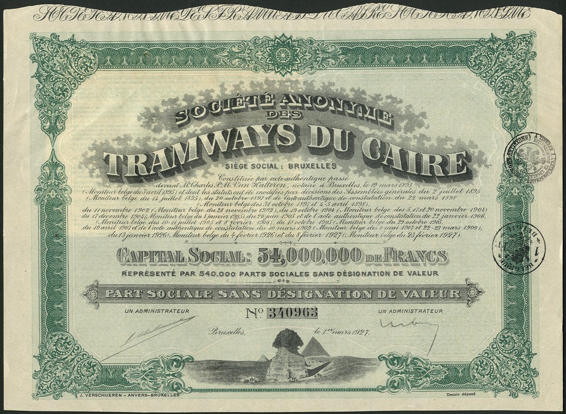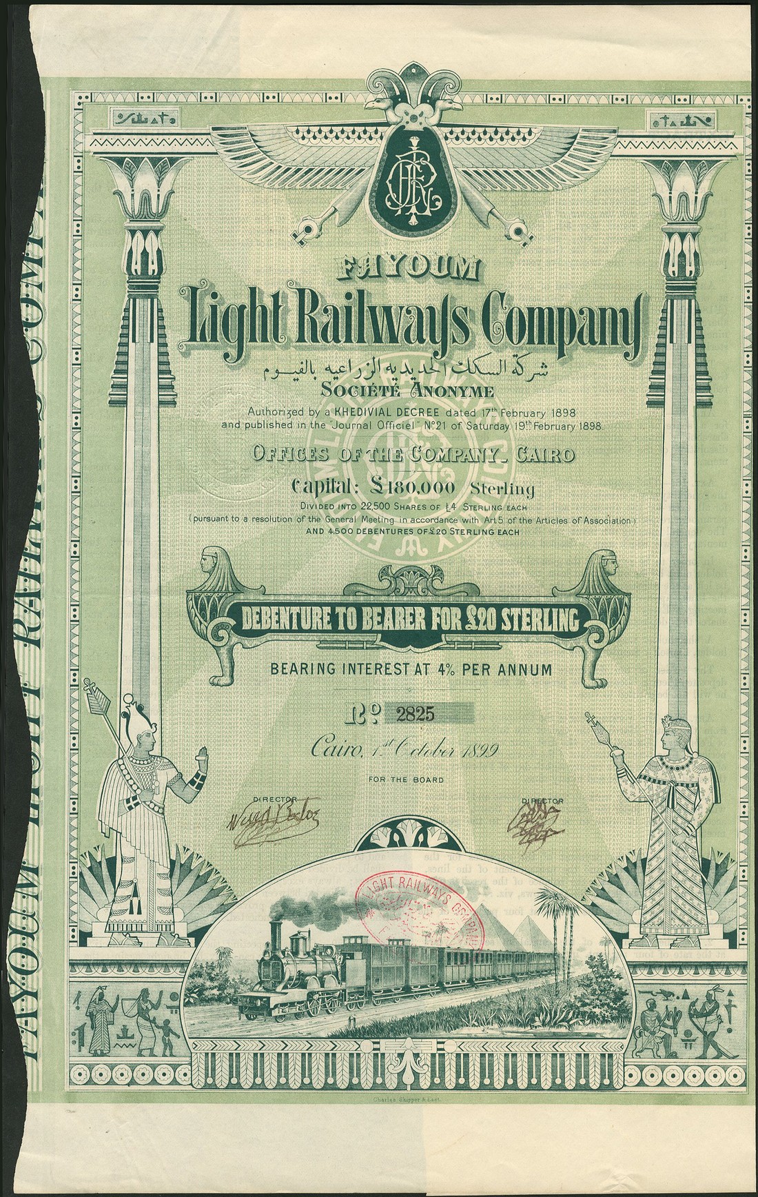 Fayoum Light Railways Co., 4% debenture for £20, Cairo 1899, steam train at bottom stylised bird at top, Egyptian figures at sides, green, with coupons, together with other transport related pieces (4) comprising Chemins de Fer de la Basse-Egypte 500 francs share 1896, another dated 1912 and a 250 franc bond dated 1934, S.A. des Tramways du Caire, 1927, generally very fine and better. (5)