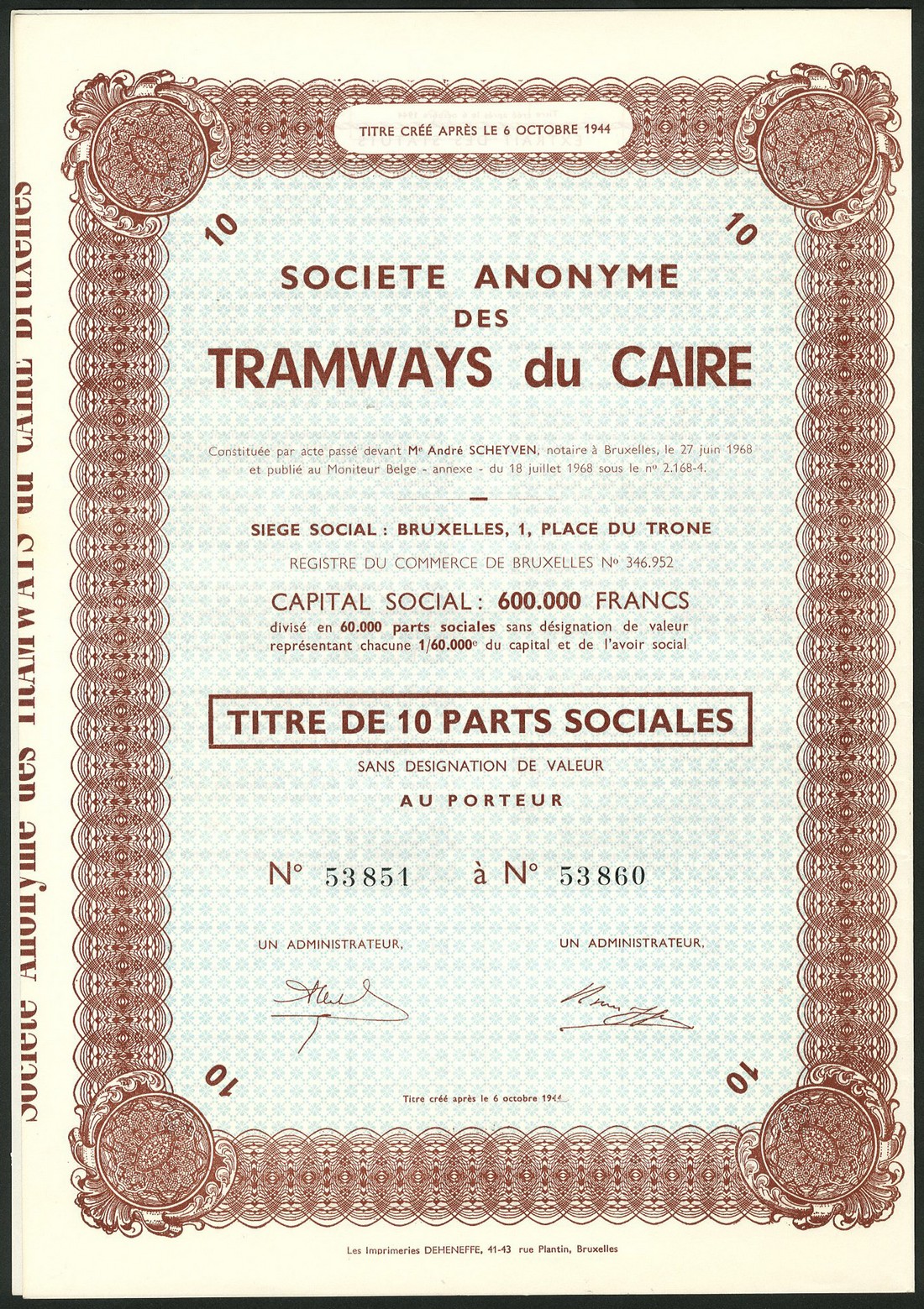 S.A. des Tramways du Caire, 10 'parts sociales', Brussels 1968, no.53851-53860, ornate border, brown, blue underprint, with coupons, extremely fine.