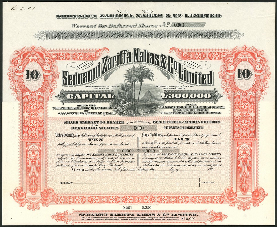 Sednaoui Zariffa Nahas & Co. Ltd., bearer warrant for 10 deferred shares of 1/-, 190-, a specimen certificate from the Bradbury, Wilkinson & Co. archives, vignette of palm trees and pyramid, text in English and French, red and black, with coupons, printers annotation for 1907 at top edge, small ink mark at top left edge, extremely fine.