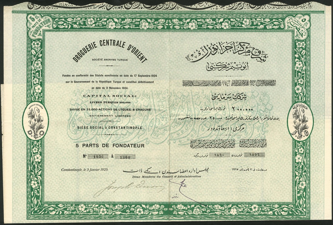 Droguerie Centrale D'Orient, certificate for 5 founders shares, Constantinople 1925, no.1856-60, large format piece with ornate borders, poppies at left and right, green and black, text in French and Arabic, with coupons, good very fine.