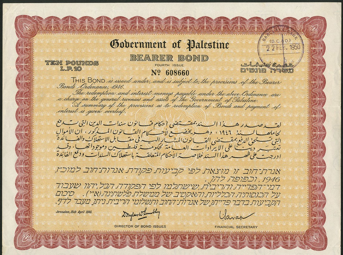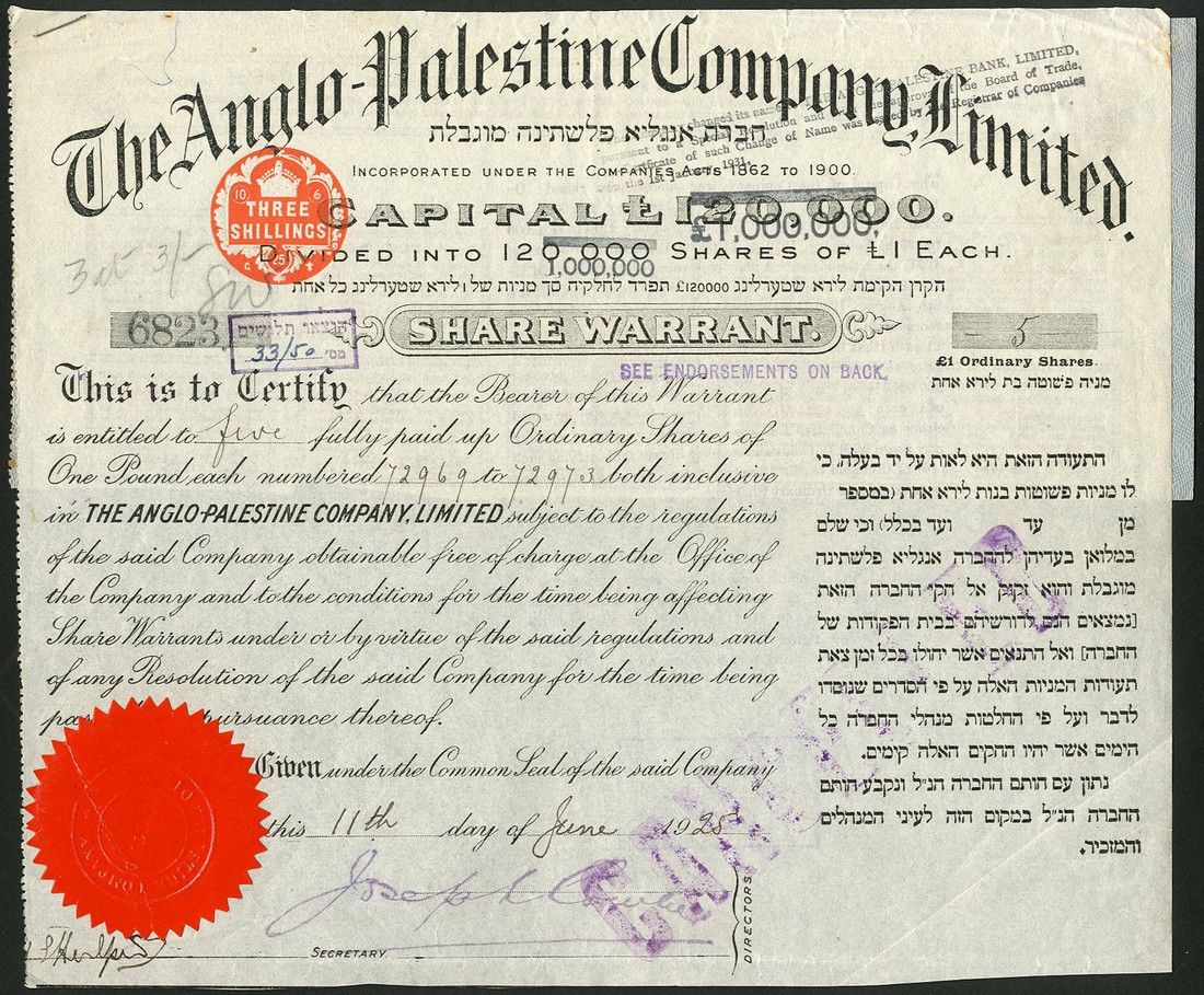 Anglo-Palestine Co. Ltd., bearer warrant for [5] ordinary shares of £1, 19[28], no.6823, black, text in English and Hebrew, red paper seal, with coupons, together with a Government of Palestine, £10 bond, 4th issue, Jerusalem 1946, red-brown, yellow underprint, with coupons, very fine and extremely fine. (2)