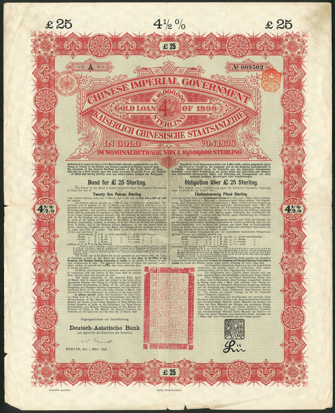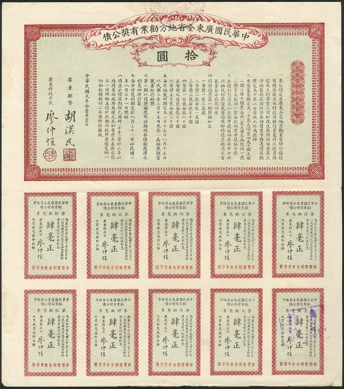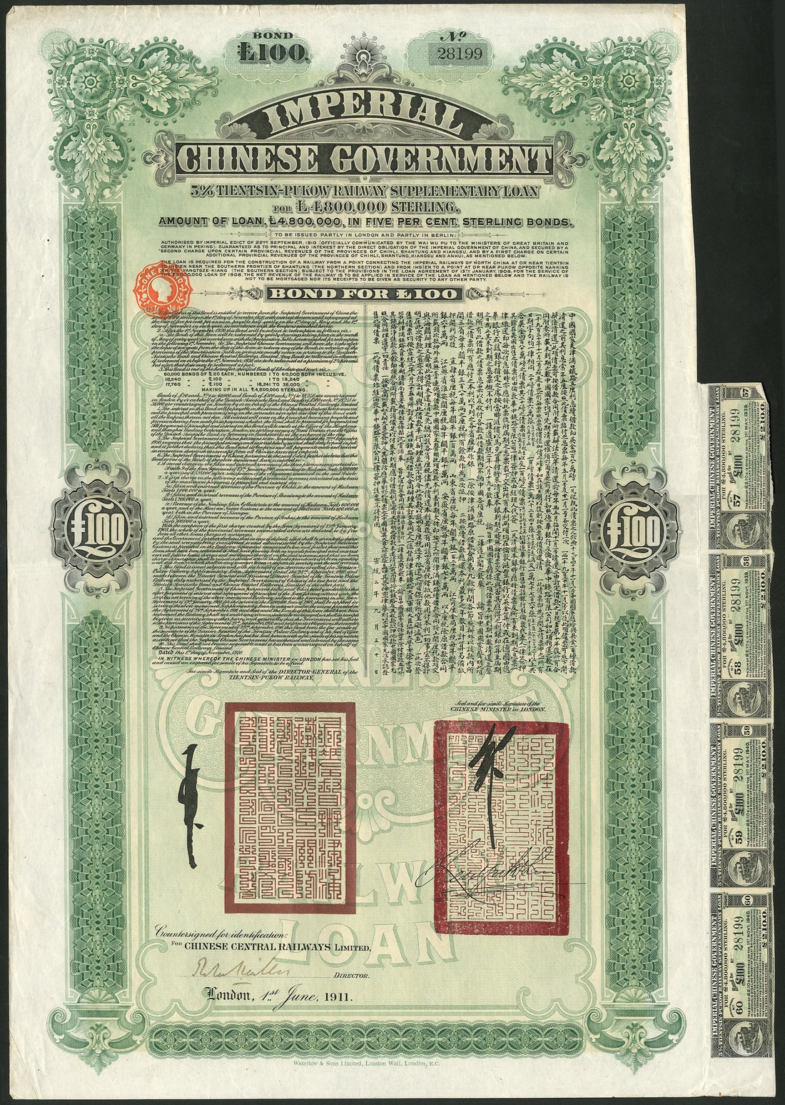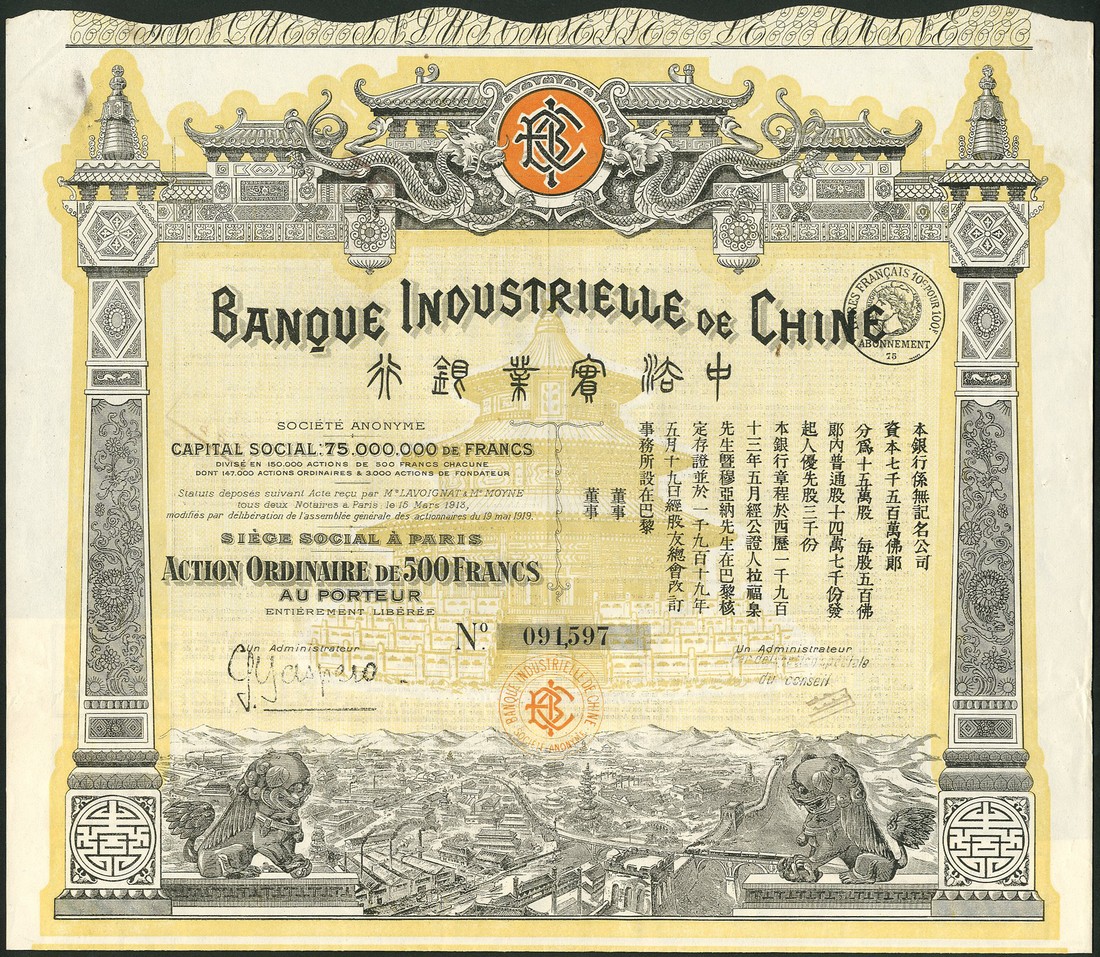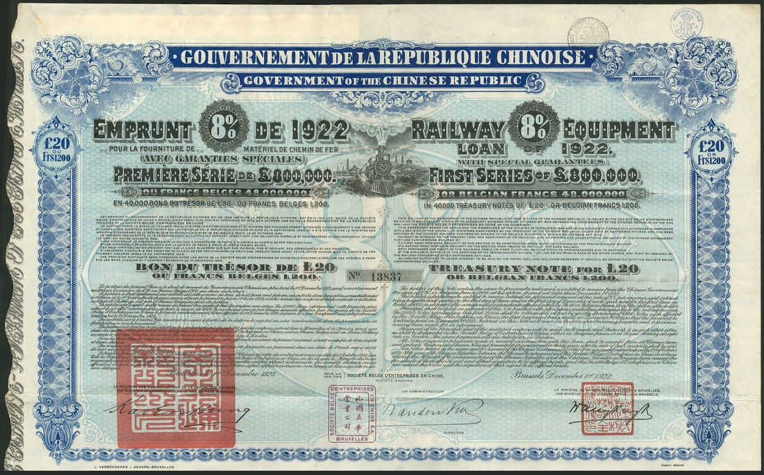 A group of Chinese certificates (7), comprising 4½ % Gold Loan of 1898, £25, Deutsch-Asiatische Bank issue, red; 5% Tientsin-Pukow Railway Supplementary Loan, bond for £100, 1911, English, green; 5% Hukuang Railways Sinking Fund Gold Loan of 1911, £100, German issue, red; 1912, Gold Loan, £20; 1922 Railway Equipment Loan; 1912 Public Loan, 10 yuan and Banque Industrielle de Chine, 500 francs, 1919, generally very fine. (7)