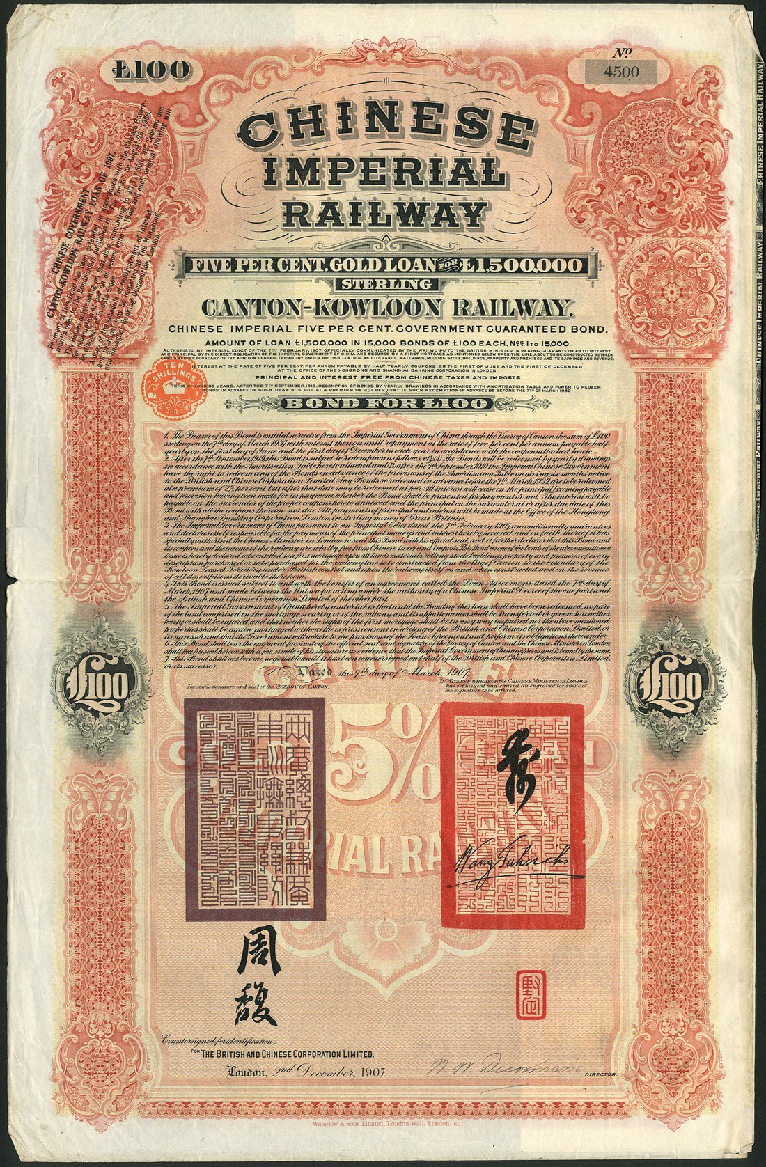A group of Chinese and other bonds (16), comprising Canton Kowloon, 1907, £100; Hukuang Railway, 1911, £100, HSBC; 1908 Tientsin Pukow Railway, £100, English; 1910 Tientsin Pukow Railway, £10, English; 1898, Gold Loan, £100, HSBC and £100 DAB; 1912 5% Gold 'Crisp' loan, £100; 1919 Vickers Loan, £100; Shanghai Nanking Railway, 1907, £100; 1925 Boxer Loan, $50; Lung Tsing U Hai Railway, 1913, £20, and other non Chinese (5) including Russia, Consolidated Railroad loan, series 1, 3125 roubles, mostly very fine and better. (16)