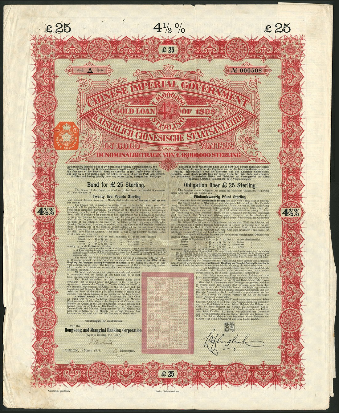 1898, 4½% Gold Loan, £25 bond, no.000508, issued by the Hongkong and Shanghai Banking Corporation, large format, ornate border, red and black, red chop in centre, with coupons, couple of small nicks at left edge otherwise good very fine and much better condition than usual