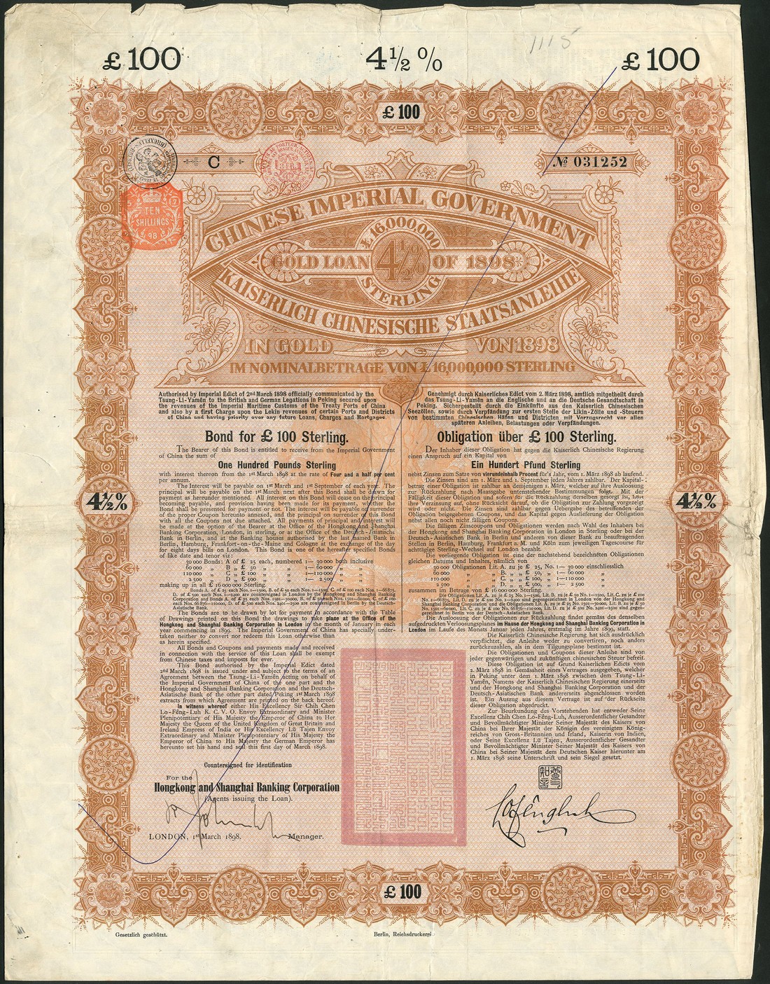 1898 4½% Gold Loan, a group of 26 bonds for £100, issued by the Hongkong and Shanghai Banking Corporation, large format, ornate border, brown and black, red 'chop' bottom centre, with coupons, mixed condition but many are fine to very fine. (26)
