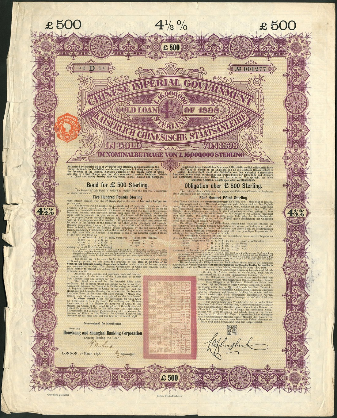 1898, 4½% Gold Loan, bond for £500, no.001277, issued by the Hongkong and Shanghai Banking Corporation, large format, ornate border, purple and black, red chop in centre, with coupons, some edge tears to left side, body and colour still strong, about very fine.