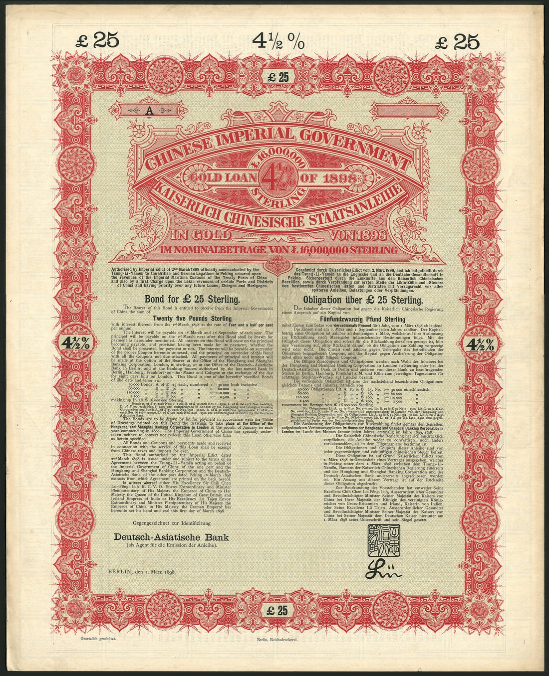 1898, 4½% Gold Loan, unissued £25 bond from the reserve stock, Deutsch-Asiatische Bank issue, large format, ornate border, red and black, not numbered, no red chop in centre, with all coupons, extremely fine and scarce