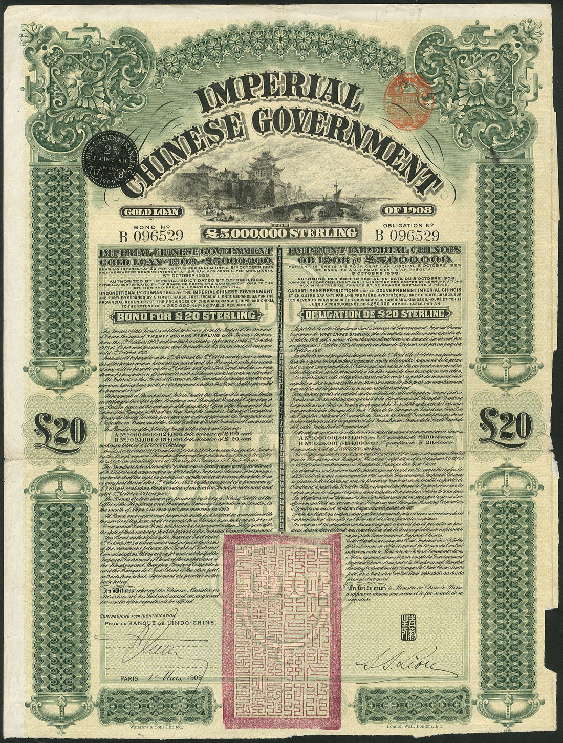 Chinese Imperial Government 5% Gold Loan of 1908, bond for £20, 1909, no.B096529, vignette under title of the Imperial Palace at Peking, countersigned by La Banque de L'Indo-Chine, text in English and French, green and black, without coupons, rough edges where coupons removed, otherwise extremely fine.