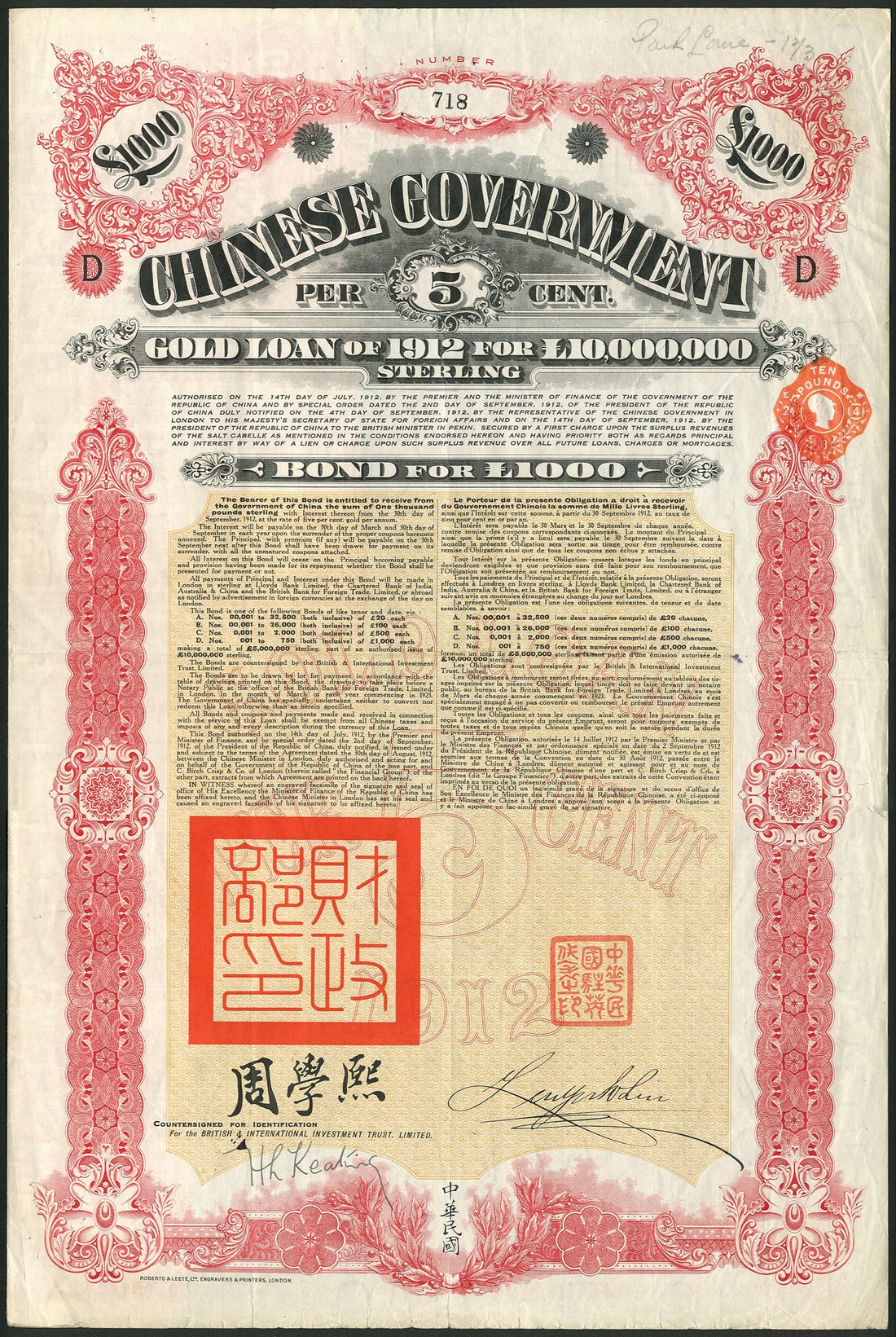 1912 5% Gold 'Crisp' Loan, bond for £1000, no.718, large format, ornate border, red and black with yellow underprint, red 'chops', with coupons, small edge tear at bottom, almost very fine and a nice example of this scarce high denomination.