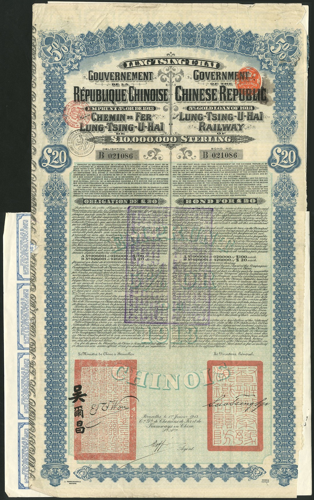 1913 Lung Tsing U Hai Railway, 5% Gold Loan, a group of 10 bonds of £20, large format, blue and black, text in French and English, with coupons, some with edge tears but generally very fine. (10)