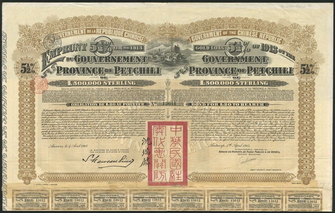 Province of Petchili, 5½% Gold Loan, 1913, bond for £20, no.13641, very large format piece with vignette of Chinese shipping with mountains in background, brown and black, red 'chop' in centre, text in French and English, with coupons (reattached at bottom), very fine.