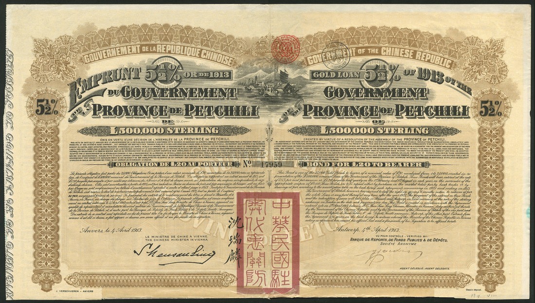 Province of Petchili, 5½% Gold Loan, 1913, bond for £20, no.17959, very large format piece with vignette of Chinese shipping with mountains in background, brown and black, red 'chop' in centre, text in French and English, with coupons (reattached at bottom), very fine.