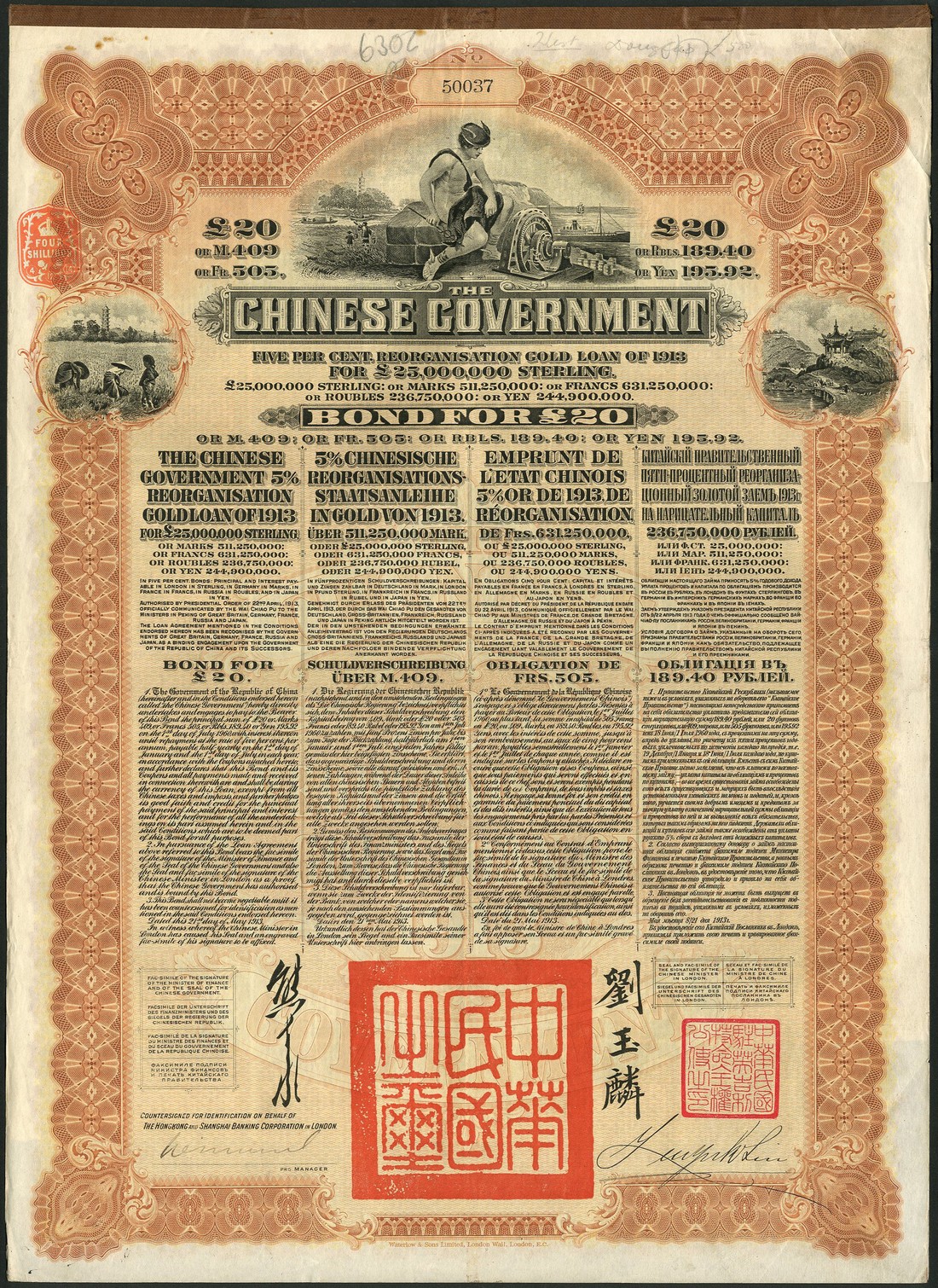 1913 5% Reorganisation Gold Loan, a group of 24 bonds for £20, issued by the Hongkong & Shanghai Banking Corporation, 'Mercury' at top, peasants and buildings at either side, brown and black, printed by Waterlow & Sons, with coupons, generally very fine and better. (24)