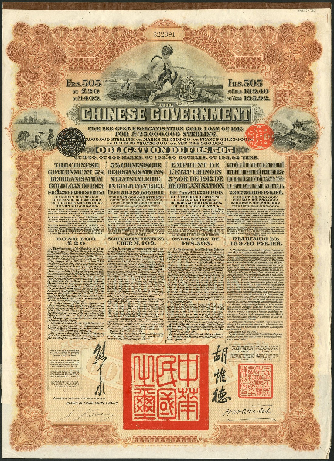 1913 5% Reorganisation Gold Loan, a group of 21 bonds for £20, issued by the Banque de L'Indo-Chine, 'Mercury' at top, peasants and buildings at either side, brown and black, printed by Waterlow & Sons, with coupons, generally very fine and better. (21)