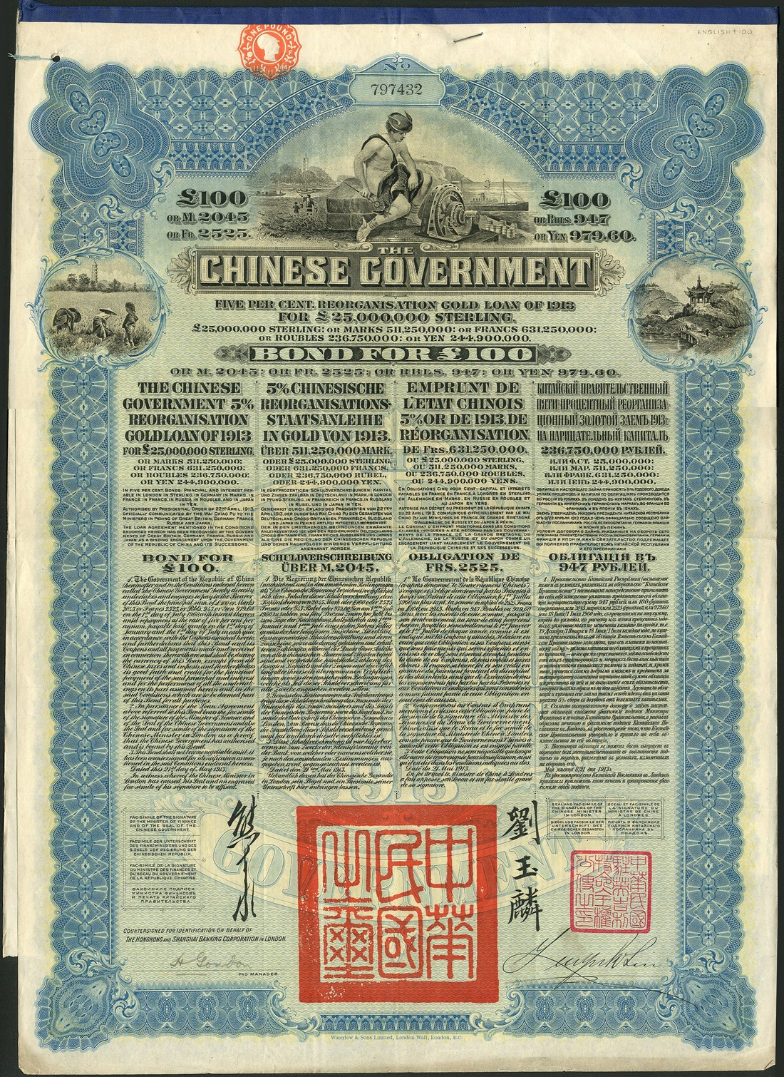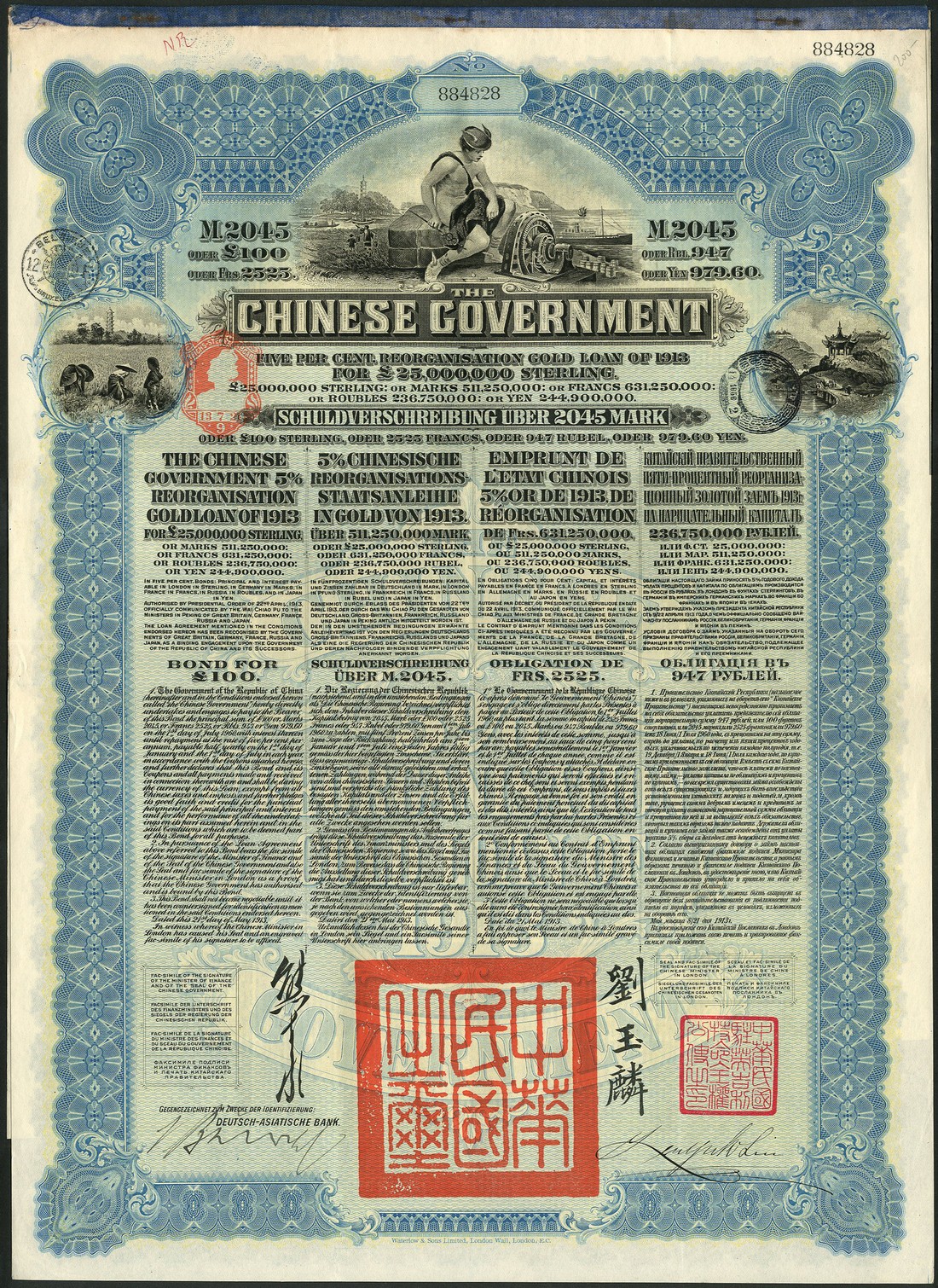 1913 5% Reorganisation Gold Loan, £100 bond issued by the Deutsch-Asiatische Bank, no.884828, 'Mercury' at top, peasants and buildings at either side, blue and black respectively, printed by Waterlow & Sons, with coupons, good very fine but small red ink mark in top margin