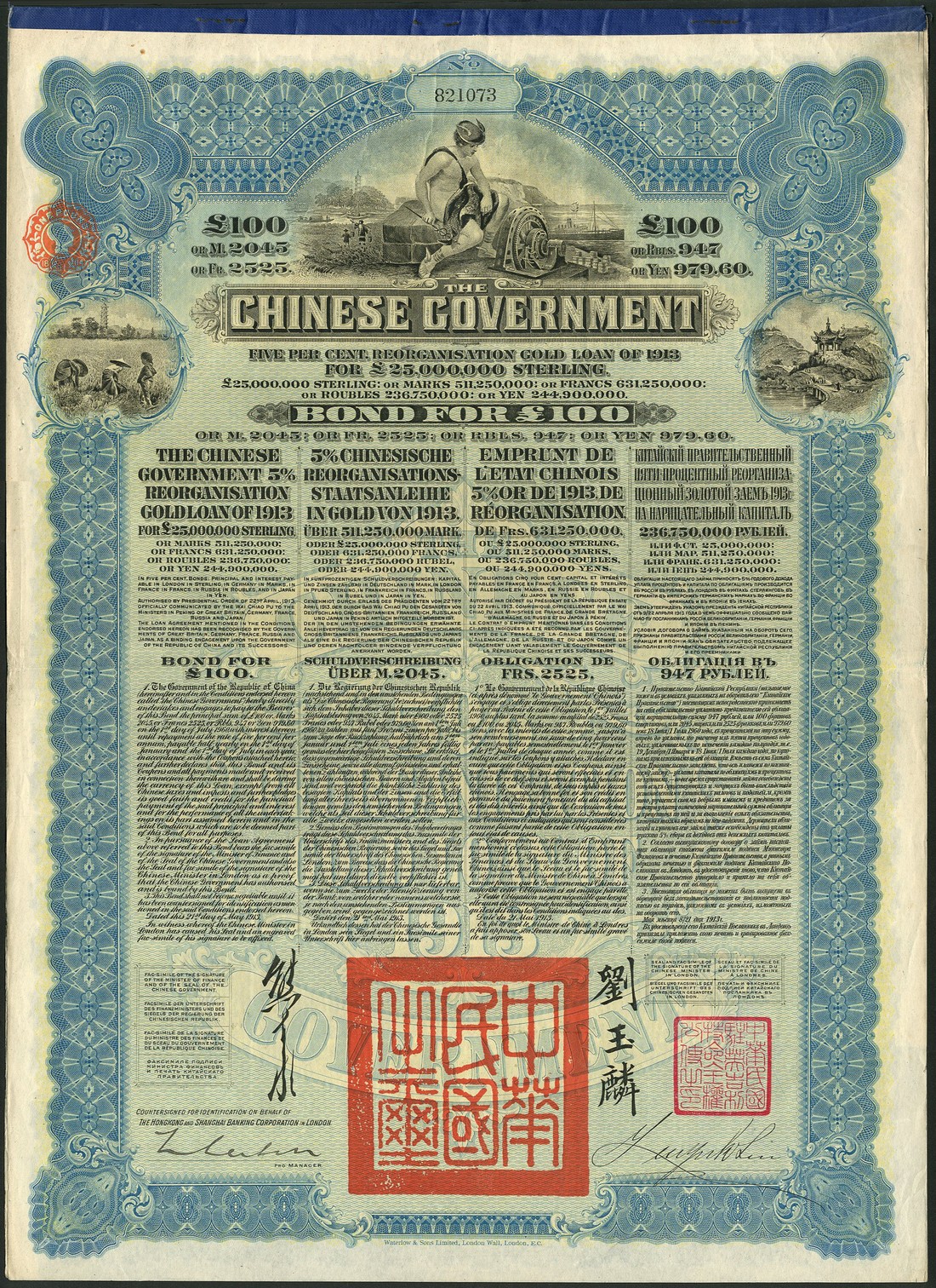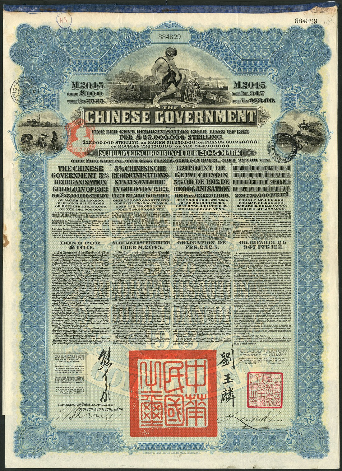 1913 5% Reorganisation Gold Loan, £100 bond issued by the Deutsch-Asiatische Bank, no.884829, 'Mercury' at top, peasants and buildings at either side, blue and black respectively, printed by Waterlow & Sons, with coupons, good very fine