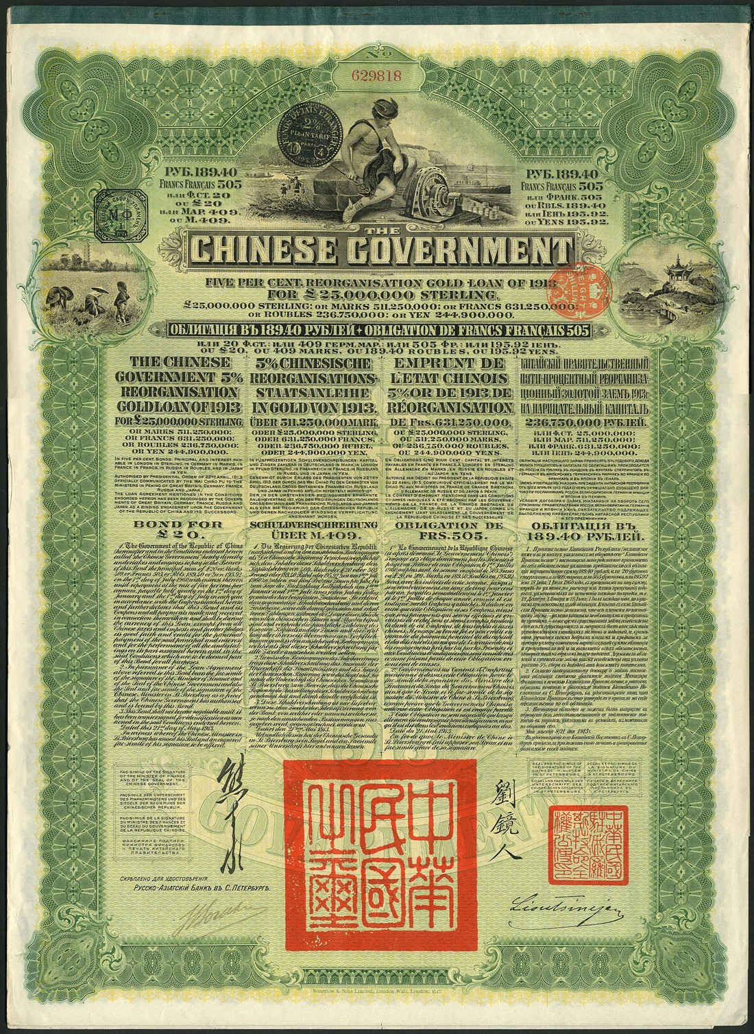 1913 5% Reorganisation Gold Loan, a group of 5 £20 bonds issued by the Russo-Asiatic Bank, 'Mercury' at top, peasants and buildings at either side, green and black, printed by Waterlow & Sons, with coupons, one with small cut and another with small taers at bottom edge, very fine and better. (5)
