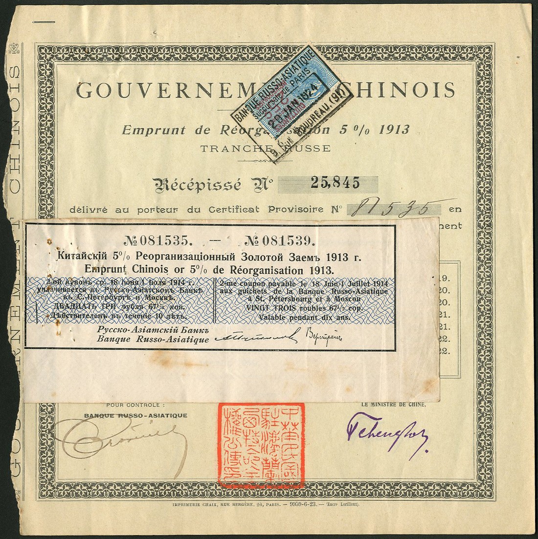 1913 5% reorganisation Gold Loan, a group of 5 receipts for repayment of coupon payable 1914, attached to original coupon for 5 bonds numbered 081535-081539, small format, black on pale green paper, french adhesive duty stamps, red 'chop' at bottom, very fine and very rare with original coupon.