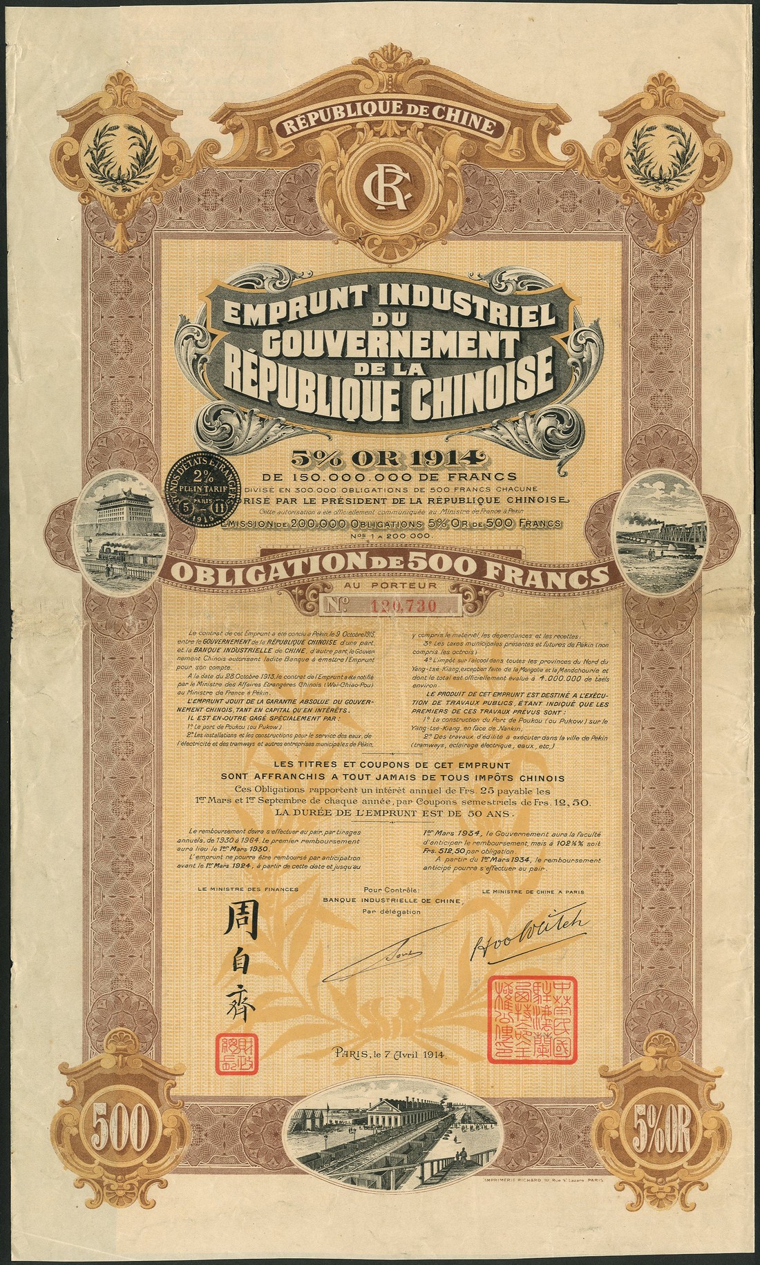1914 5% Emprunt Industrielle, unissued provisional certificate for 500 francs from the reserve stock, ornate border, blue and beige, with 1914 500 francs bond dated 1914, 1914 issued bond trimmed, reserve stock extremely fine and rare